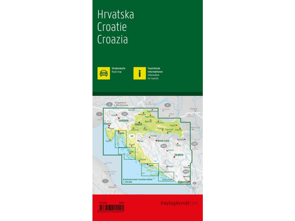 S automapou Chorvátska v mierke 1:500 000 sa dovolenkári cestujúci autom, motocyklom alebo karavanom ľahko zorientujú. Rozsiahla cestná sieť je presne zobrazená a na mape sú vyznačené vzdialenosti a početné zaujímavé miesta.
