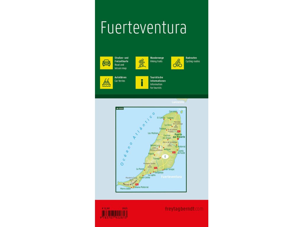 Okrem prehľadného dizajnu obsahuje cestná mapa „Fuerteventura 1:100 000“ množstvo dodatočných informácií, ako sú podmienky na cestách, pamiatky a kempingy. Rýchlu orientáciu umožňuje aj rozsiahly index polohy. Podrobnosti: Turistické informácie, prístavy, vzdialenosti v km; Cestné mapy freytag & berndt sú dostupné pre mnohé krajiny a regióny po celom svete.