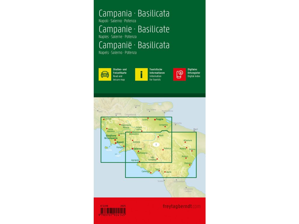 Cestná mapa Kampánie - Basilicaty v mierke 1:150 000 obsahuje všetky dôležité informácie pre cestovateľov, ktorí navštívia túto taliansku dovolenkovú oblasť. Komplexná cestná sieť je presne znázornená, malebné cesty sú farebne odlíšené a na mape je vyznačených mnoho turistických atrakcií.