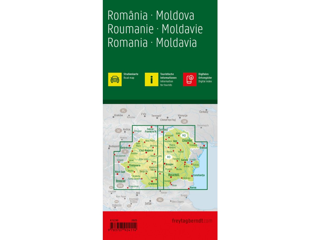 Cestná mapa Rumunska - Moldavska v mierke 1:500 000 je ideálna pre cestujúcich autom, motocyklom alebo karavanom. Rozsiahla cestná sieť je presne zobrazená a na mape sú vyznačené vzdialenosti a mnohé výletné destinácie.
