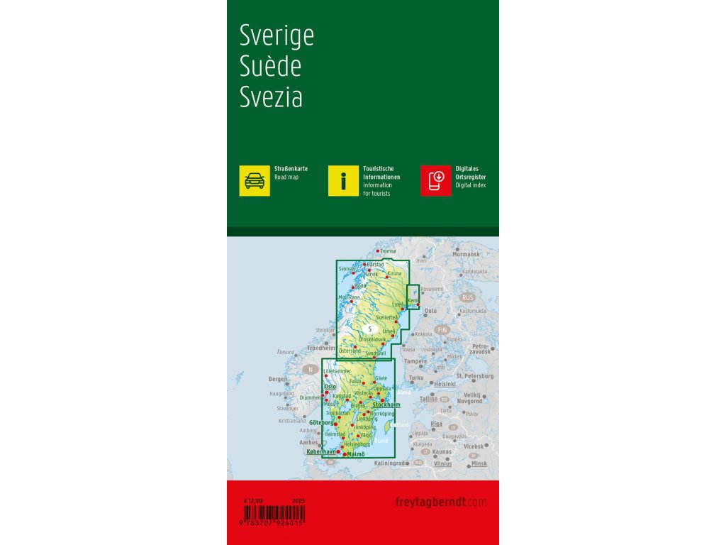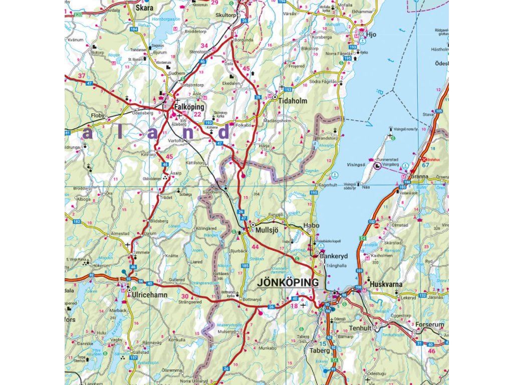 S mapou Švédska v mierke 1:600 000 sa cestujúci autom, motocyklom alebo karavanom ľahko zorientujú. Rozsiahla cestná sieť je presne zobrazená a na mape sú vyznačené vzdialenosti a mnohé výletné destinácie.
