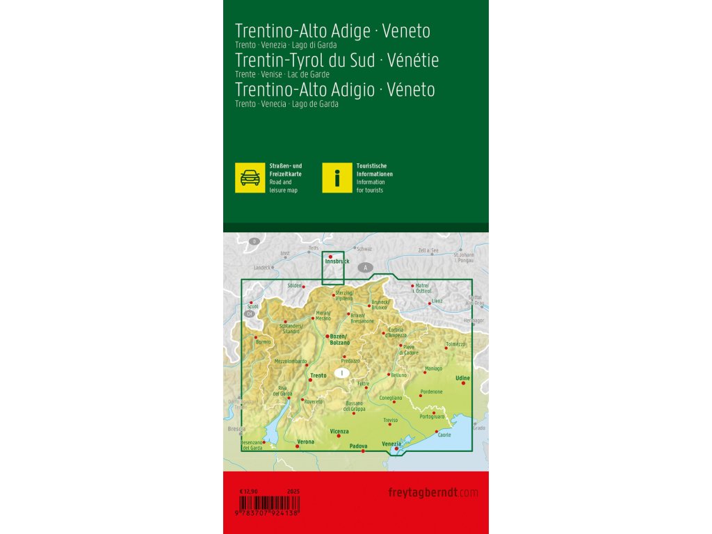 Cestná mapa Trentino- Južné Tirolsko - Benátsko v mierke 1:200 000 obsahuje všetky dôležité informácie pre dovolenkárov, ktorí navštívia Južné Tirolsko a Benátsko autom, motocyklom alebo karavanom. Komplexná cestná sieť je presne znázornená a na mape je vyznačených mnoho turistických atrakcií.